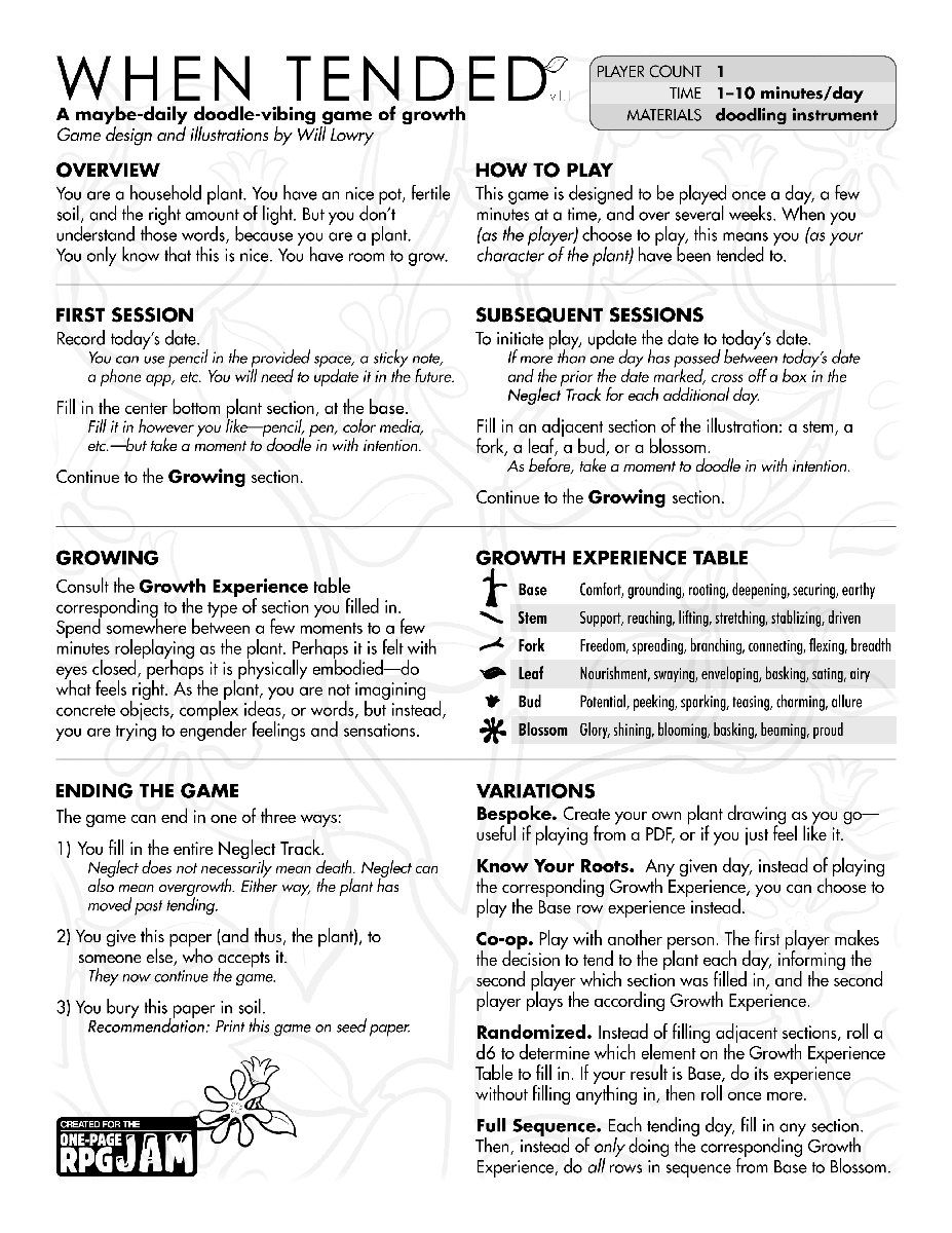 Each day, you will doodle in one section of the illustration on the back. Afterwards, you consult the Growth Experience table for the sensations corresponding to the part you doodled in. Take on the role of the plant, and play by channeling those sensations for however long you wish.